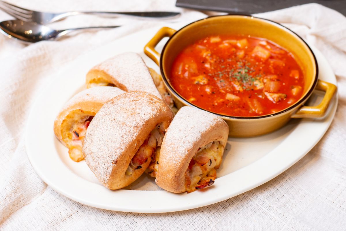 ベーコンや玉ねぎなどがたっぷりと入ったハード系のパンと、トマトベースの赤いクラムチャウダー。おいしく、食べ応えがあるだけでなく、ルックスもおしゃれです。素敵にスタイリングすれば、冬の食卓があたたかく、かつ華やかな印象に。