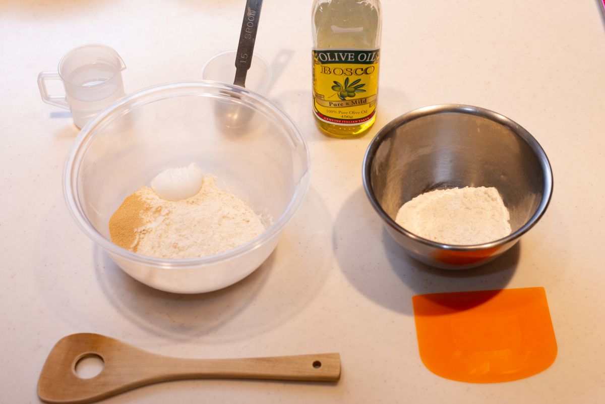 まずは、パンの生地を作ります。使う材料は、強力粉と全粒粉、インスタントドライイースト、砂糖、オリーブオイルなど。