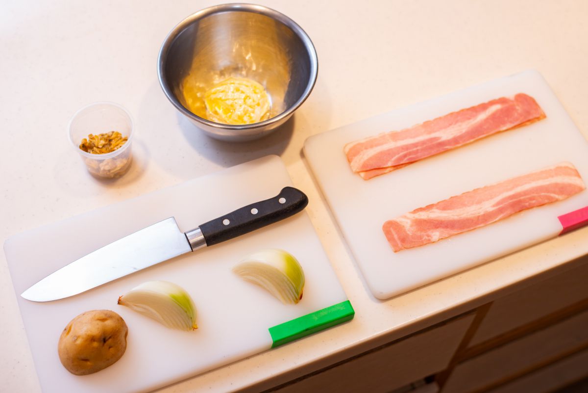 パン生地を一次発酵させている間に、マンハッタンクラムチャウダーとパンの具材を作ります。マンハッタンクラムチャウダーの材料は、あさり、玉ねぎ、ベーコンなど。また、パンの具材は、ピザ用チーズ、ベーコン、玉ねぎなどです。