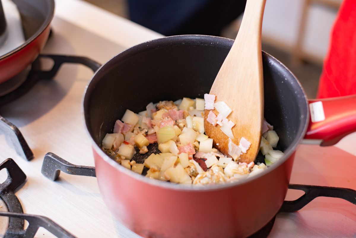 切った玉ねぎとベーコン、じゃが芋、そしてあさりを炒めます。
