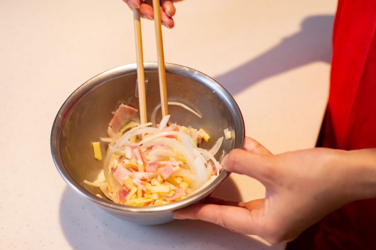 こちらは、パンの具材となる材料。ボールに入れ、ざっくりと合わせます。