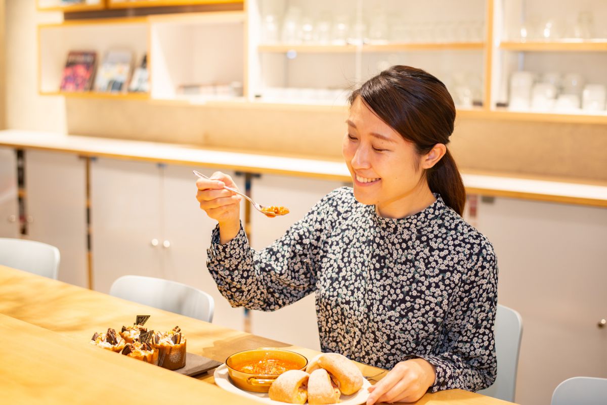 作ったオニオンベーコン&マンハッタンクラムチャウダーは、キッチンスタジオ内にあるラウンジで食べることができます。また、もしもその場で食べきれなくてもご安心を。オニオンベーコンは、ボックスに入れて持ち帰ることができます。