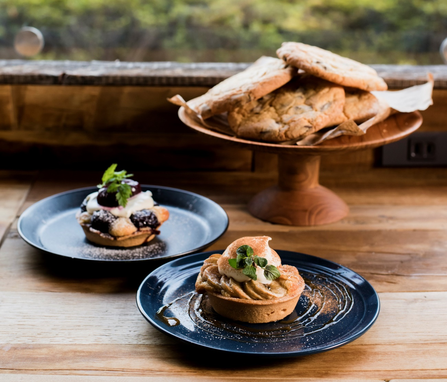 スイーツは「季節の焼き立てタルト」(手前)各346円や、「自家製チョコチップクッキー」(奥)210円などがショーケースから選べます。