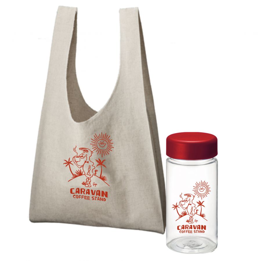 店内では「オリジナルクリアボトル」(右)2500円や、「オリジナルマルシェバッグ」(左)2000円などのブランドオリジナルのグッズや、種類豊富なコーヒーも販売。自宅用やプレゼント用にピッタリです。