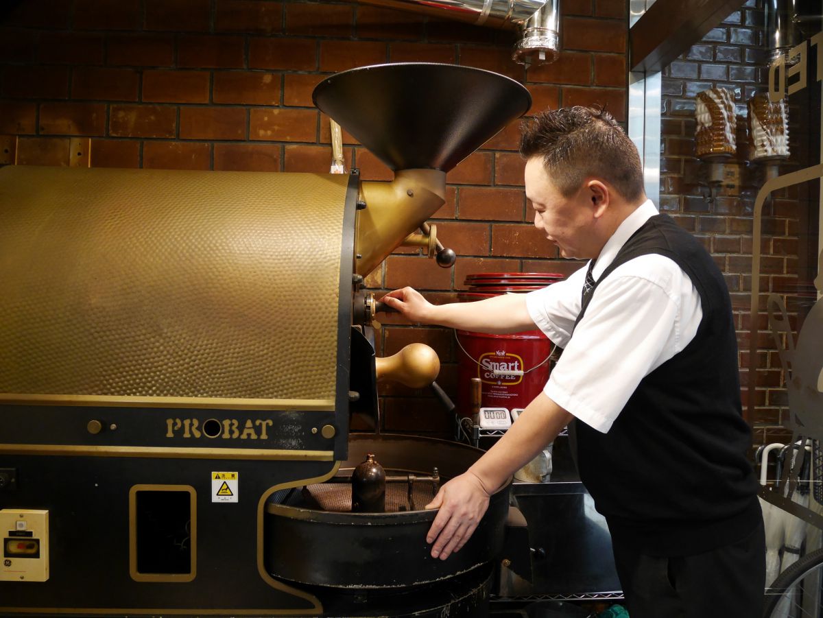 珈琲豆は三代目オーナー元木章さんが、ドイツ製の焙煎機を使い自ら焙煎。使う豆は、コロンビア、ブラジル、エチオピア、インドネシア、ドミニカなど5種。見た目、香り、はぜる音などを五感を使って感じ取り、豆と会話しながら90年近く続く「スマート珈琲」の味を再現し続けています。