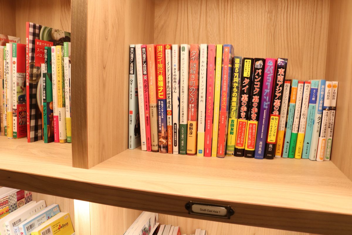 そして北側の壁一面は本棚になっていて、ずらりと旅の本が並びます。