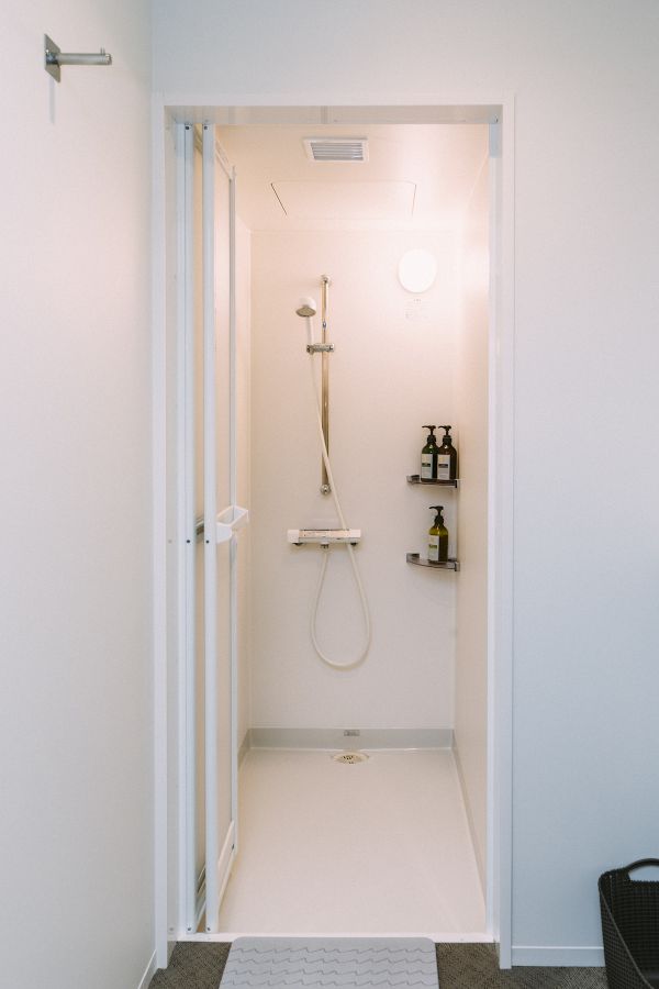 各シャワーブースは脱衣スペースもゆったりしており、施錠できるので安心。シャワーヘッドも美髪、美肌に効果的なものが使われています。