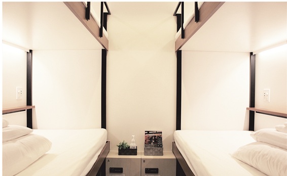 ベッドの壁にはちょっとした物が置ける棚や鏡、USBコンセントやセキュリティーボックスも完備しています。グループでもプライベート空間を保て安心して利用できますね。