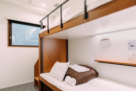 ホステルには珍しいバス・トイレ・洗面独立型のタイプも多く、最大4名まで泊まれるスタンダードツインルーム(1泊7000円~)は、2段ベッドが2つ入った客室。合宿感覚でお泊りできて楽しそう!