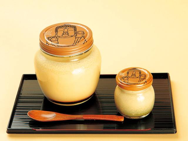 大仏のイラストが目を引く「まほろば大仏プリン」はおみやげに。安心安全な食材や奈良の食材をできるだけ取り入れ、最高級の生クリームを使用したプリンは、何個でも食べたくなるおいしさです。サイズは大・小あり、大サイズは昔ながらの硬めの食感が特徴。小サイズはとろけるようなクリーミーさが後を引きます。定番のカスタードのほか、ショコラやレアチーズ、大和茶、地酒、カプチーノなどバラエティ豊か。いろいろな味を買い込んで、食べ比べてみるのも楽しみです。