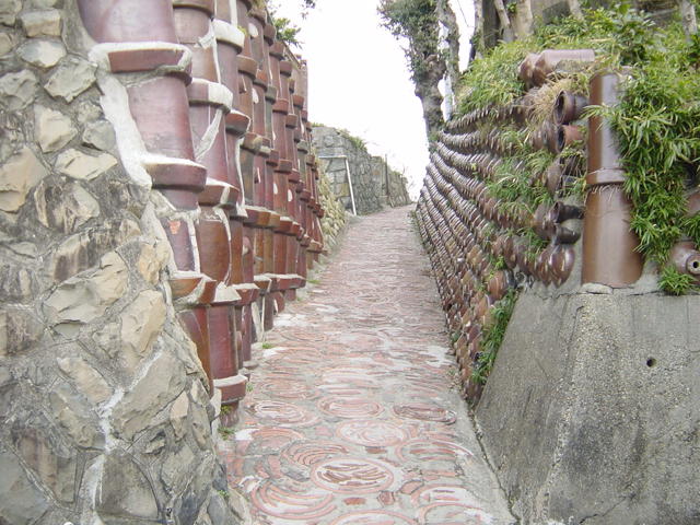 常滑駅の南東の小高い丘の周辺にあるのが、常滑観光に欠かせない「やきもの散歩道」。細い路地がまるで迷路のように入り組んでいて、古い町並みの中に、土管や焼酎瓶が積まれた土管坂、国の重要文化財・登窯など、焼きものの町を象徴するスポットが点在しています。主要スポットを回るなら、所要時間は1時間ほど。散歩道には常滑焼の工房やギャラリー、カフェなどもあるので、寄り道しながらのんびり散策してみましょう。