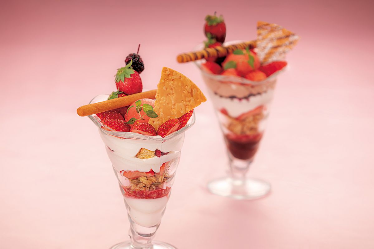 イチゴが主役のパフェは2種類。「プレーンパフェ」1997円は、ヨーグルトやコーンフレーク、丸の内はちみつのカステラがイチゴとベストマッチ。「チョコレートパフェ」1997円は、チョコレートソースやチョコチップの食感がイチゴの美味しさをより引き立てます。最後のひと口まで、イチゴの風味を楽しめるデザートです。