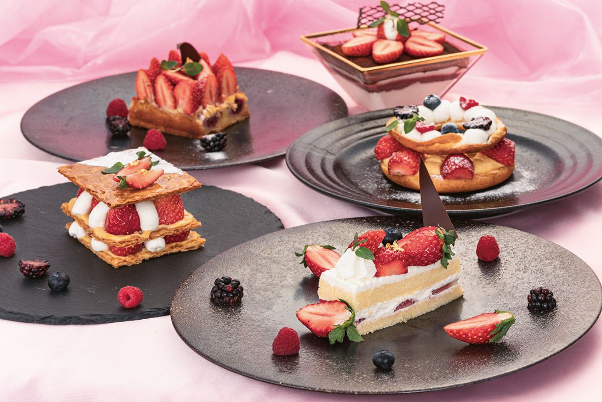 ほかにも、賑やかで彩り豊かなイチゴのスイーツがラインナップ。「ストロベリーのショートケーキ」(右前)1416円は、イチゴと生クリーム、口どけの良さにこだわった自家製スポンジケーキの絶妙なバランスです。イチゴとフランボワーズをたっぷり使った「ストロベリータルト」(左奥)1416円は、上品な味わいのカスタードクリームと、フルーツの食感とタルト生地のサクサク感がたまりません。