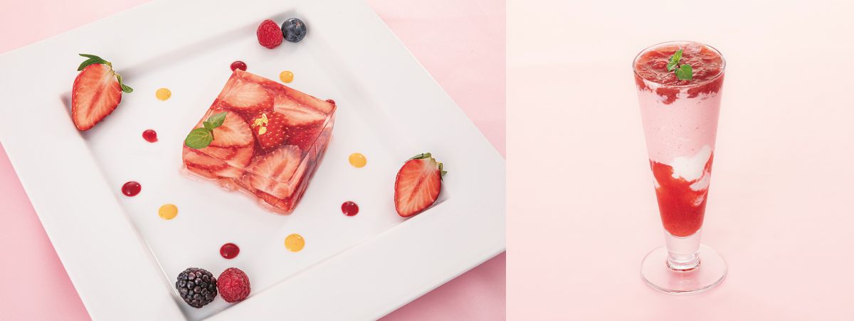 見た目も華やかな「ストロベリーゼリー テリーヌ仕立て」1416円や、ピンクが鮮やかな「ストロベリーシェイク」968円、2品種のイチゴを練乳・和三盆糖・チョコレート索子などを付けて食べる「ストロベリーの食べ比べ!」1416円など、メニューが豊富なのもうれしいですね。