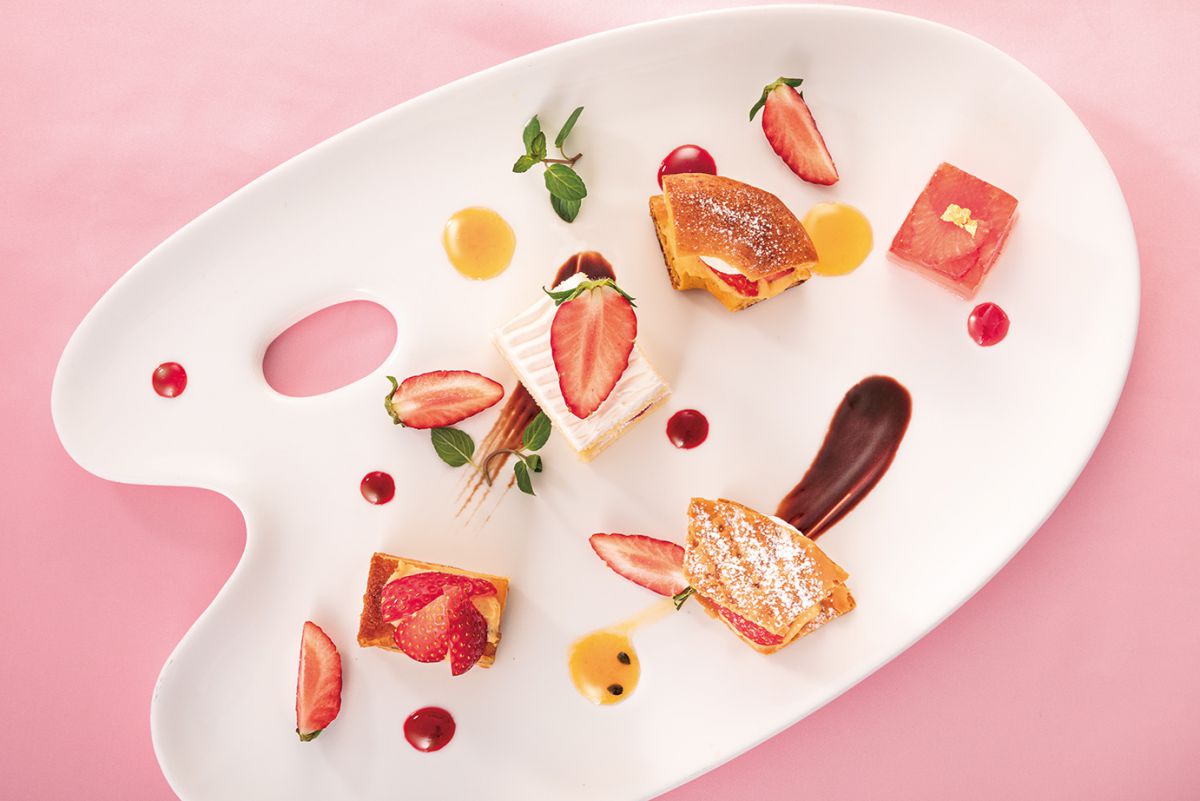 いろいろ食べてみたい欲張りさんには、フェアメニューを一度に楽しめるように「ショートケーキ」、「タルト」、「ミルフィーユ」、「パリブレスト」、「ゼリー」の5種を、少しずつ盛り合わせた「アソートプレート」2420円がおすすめ。イチゴ好きにはたまらない一皿です。