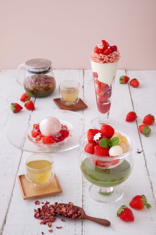 いちごの旬にあわせて登場した特製パフェは3種類。京都・福寿園の香り高い抹茶と相性抜群のいちごをたっぷりと使用した魅惑のコラボレーションです。