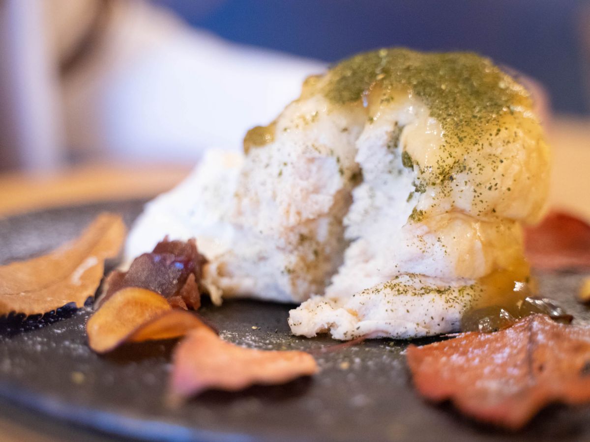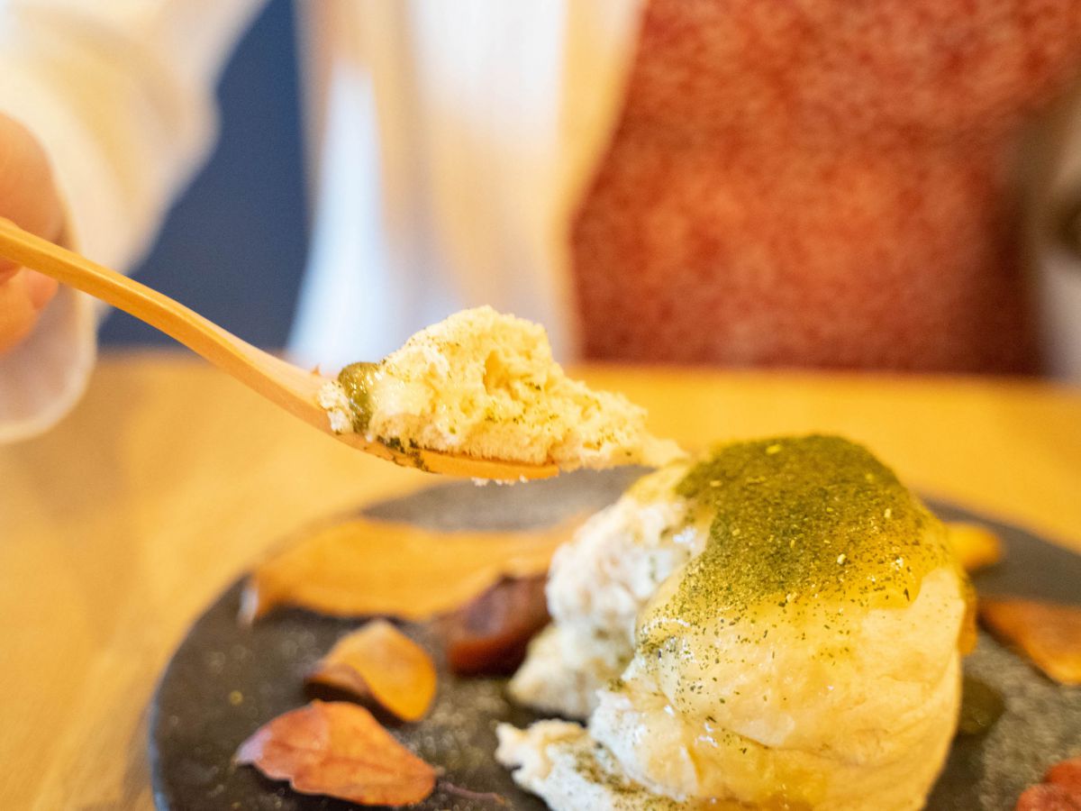 そんな「ENGAWAパンケーキ」はSNSなどで大人気なんだとか。それもそのはず、こちらは「ぶるん!」とした見た目が珍しい新感覚なスフレパンケーキ。フォークを入れると、しっかりとした弾力を感じられます。一口食べてみると、口の中でほどけるようなぷるふわ食感!このぷるふわ感は、2日間かけてじっくりと生地を焼き上げることで生まれるらしいです。