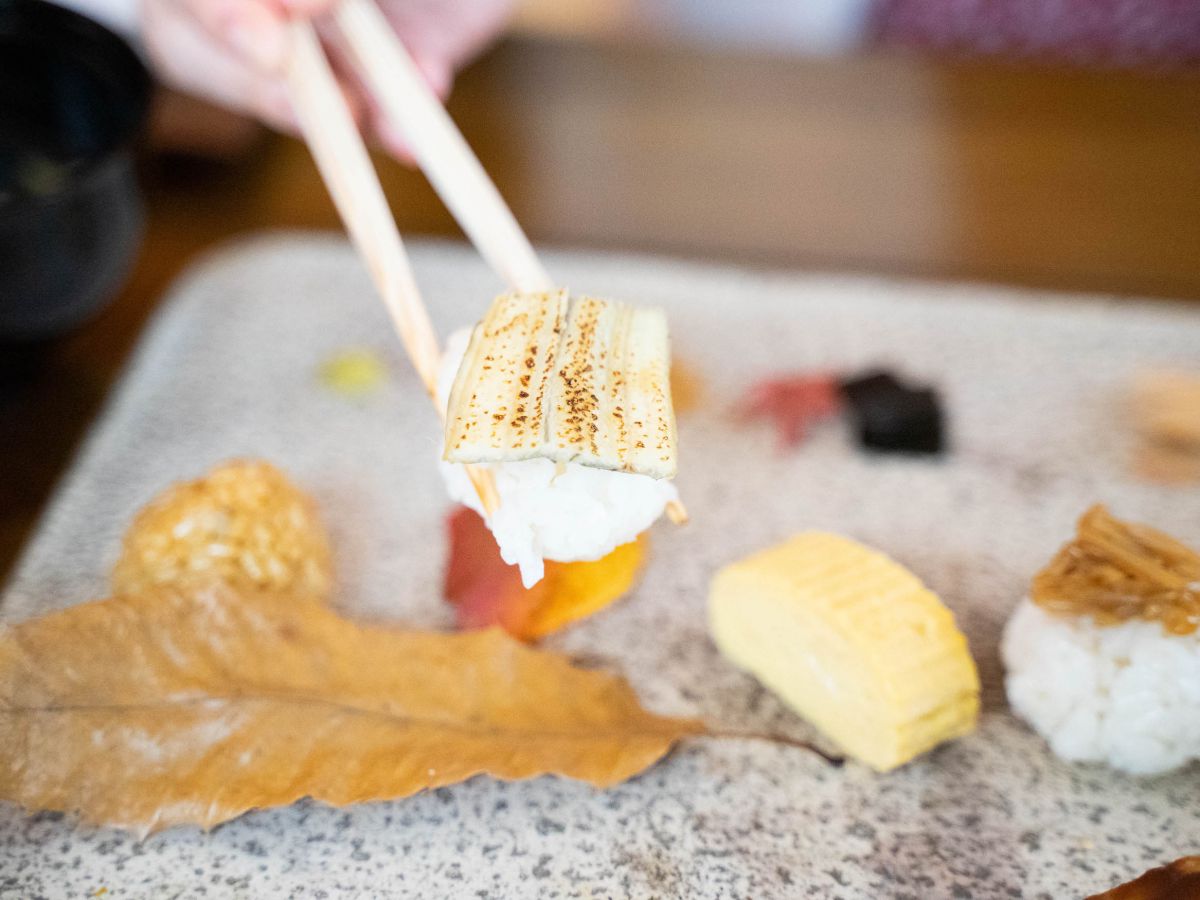 今回は煮穴子のお寿司をいただきます。もちもちの酢飯と、ほろっと柔らかい煮穴子のバランスが抜群で幸せ。お酢の味がしっかりついた酢飯と、香ばしい煮穴子の風味がベストマッチ。お料理ひとつひとつが丁寧に作られていて、毎回違ったおいしさを楽しめる贅沢ランチです。
