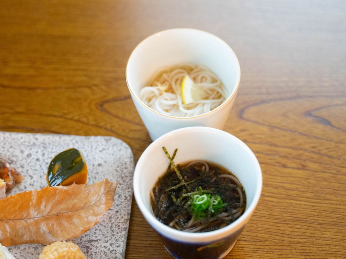 白い麺は、同じく広島県の三原市で作られた“おこめん”。お米で作られたグルテンフリーの麺で、ぷりっとした食感がおもしろい!つるつるっといただける、初体験の食感の“おこめん”でした。そしてその下のお蕎麦は、こちらも同じく広島県の江田島にある「迫製麺所」で手作業で作られたもの。2日間天干しされた手作りのお蕎麦は、香り豊かで絶品です!