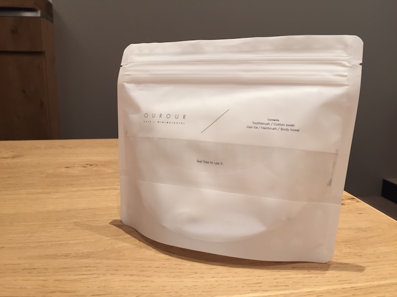 受付時にもらえるアメニティも、シンプルで機能的。歯ブラシ、ヘアゴム、ヘアブラシ、ボディタオル、綿棒が入っています。