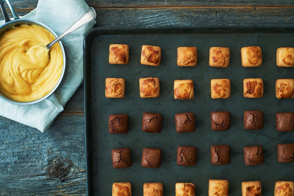 1階で注目したいお店は2軒 ! 「ベイカーズカスタード」は、カスタードをキューブ型に焼き上げていて、ほろほろなクッキー生地としっとりしたカスタードが合わさった、絶品の新食感スイーツ。プレーンとショコラ味が2個ずつ入った計4個入りで、648円!