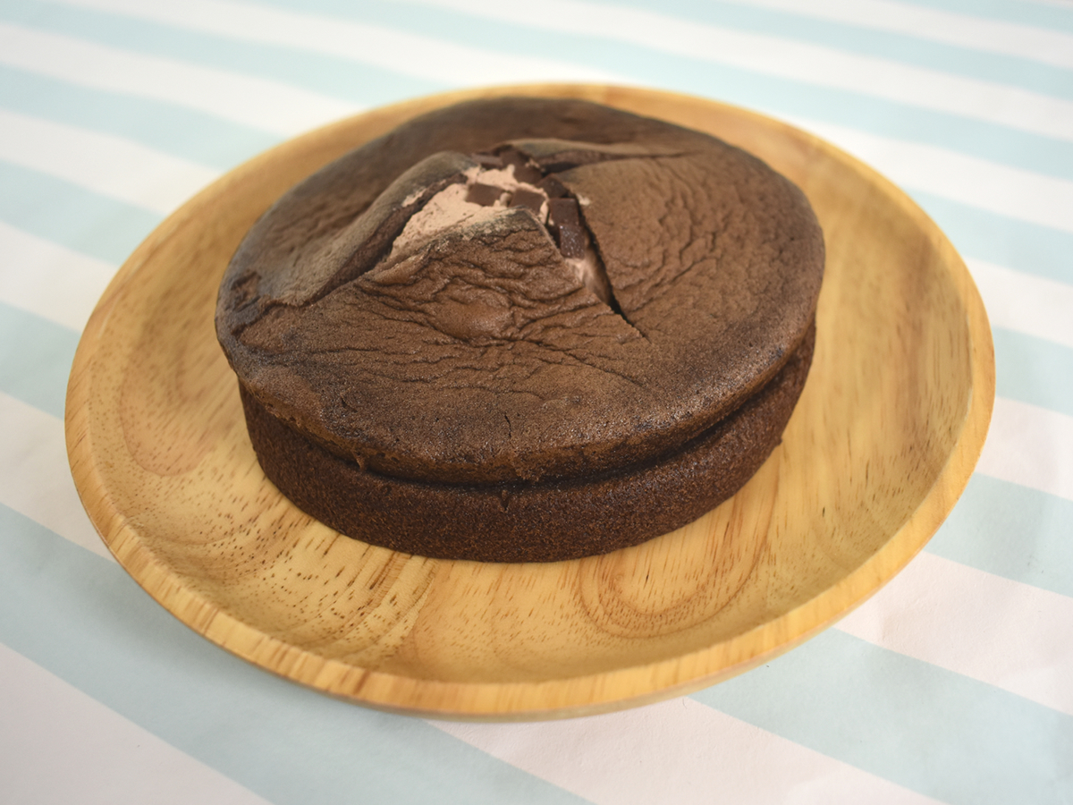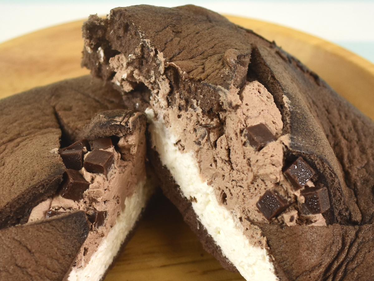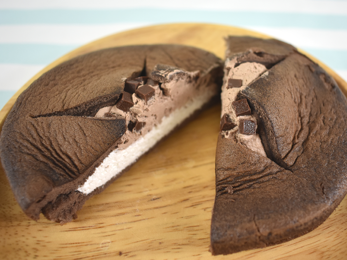 同商品のパッケージを開けてみると、ブラックカラーのスポンジがお目見えしました。山のような形をしているスポンジは、頂上の部分に“十の字”の切れ込みが。“チョコクリーム”と“キューブチョコ”が顔を出しており、カカオの香りが鼻を抜けていきます。