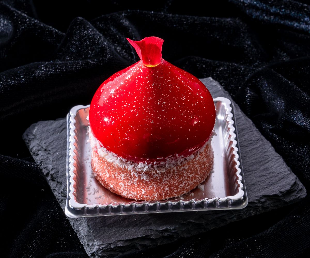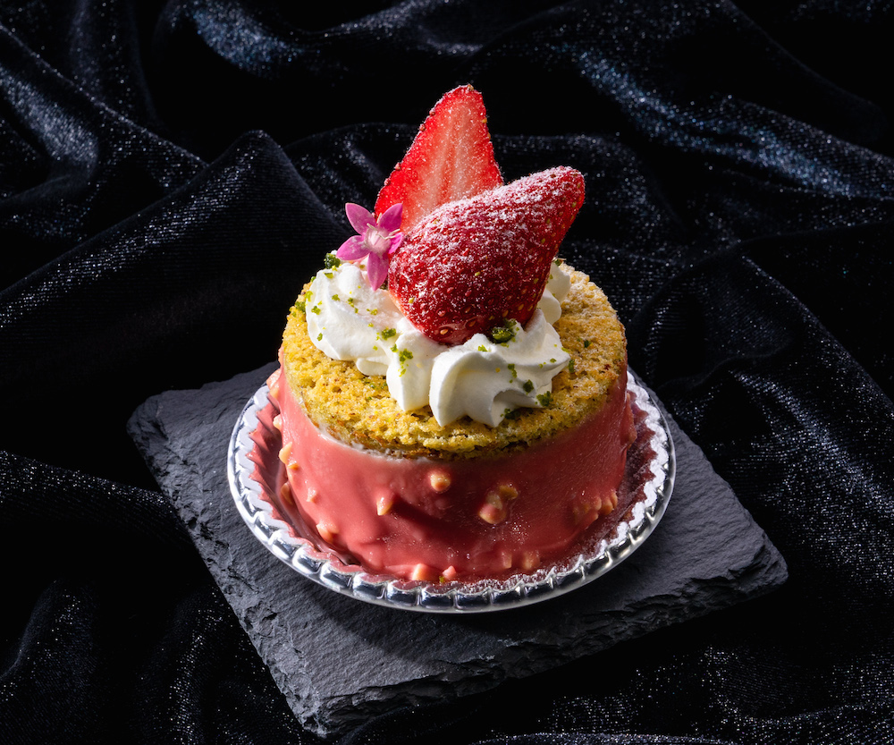 ピスタチオクリームといちごゼリーが入ったいちごムースを、いちごチョコとアーモンドで包んだ「フレーズピスターシュ」。