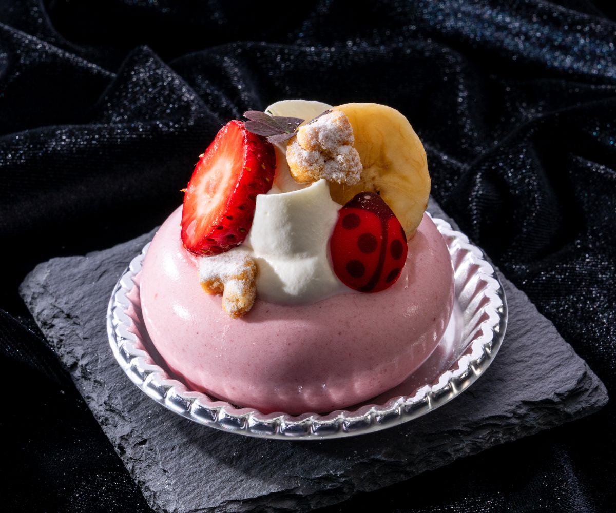 いちごムースの中に、相性の良いバナナ生地を合わせ、生クリームを飾った「いちごとバナナのガトー」。