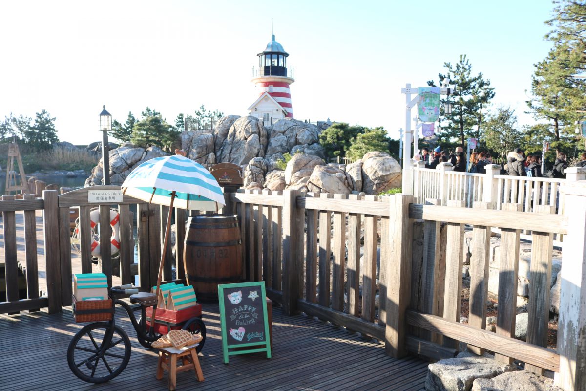 ケープコッドのあちこちにダッフィー&フレンズやそれぞれのフォトロケーションも。こちらはジェラトーニ。三輪車にはワッフルが入ったお菓子の袋がいっぱい。