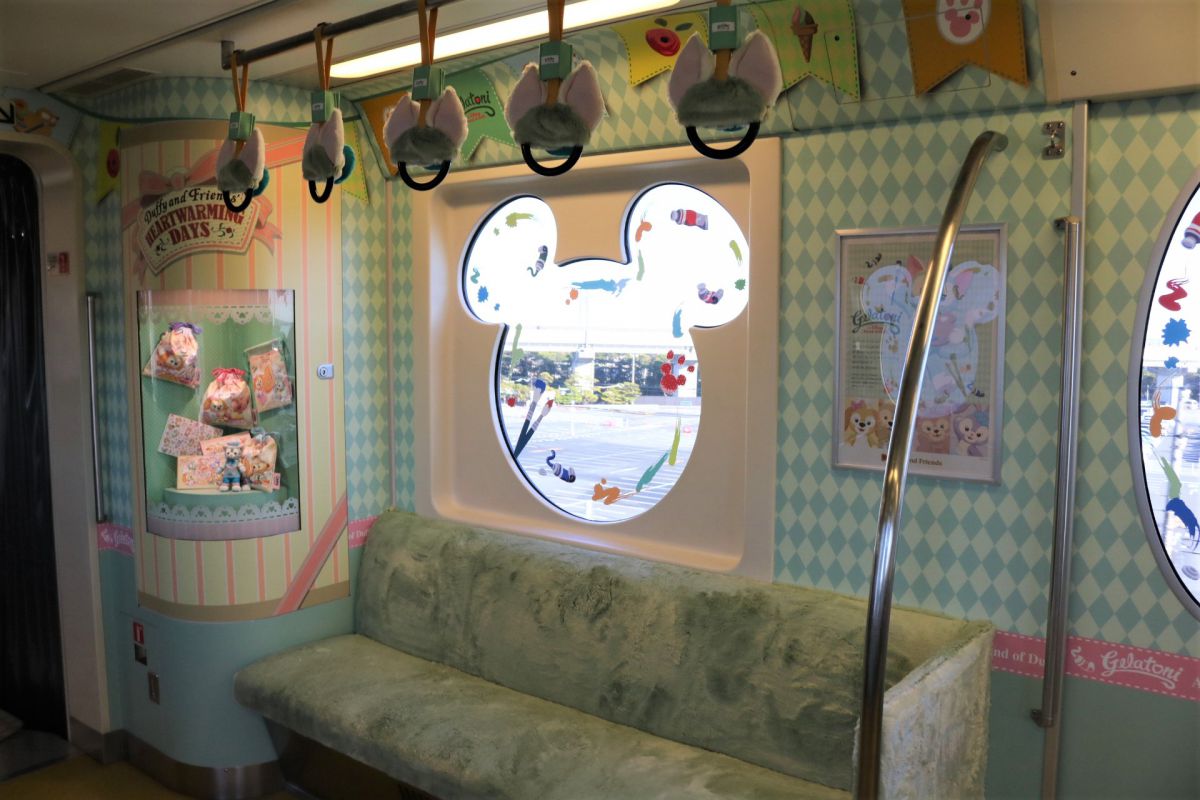 5両編成のディズニーリゾートライン。車両ごとに内装が異なり、1両目はダッフィー、2両目はシェリーメイ、3両目はジェラトーニ、4両目がステラ・ルー、最後の5両目がクッキー・アンです。パークに登場した順なので覚えやすいですね。まずはお気に入りのキャラクターの車両にGO!