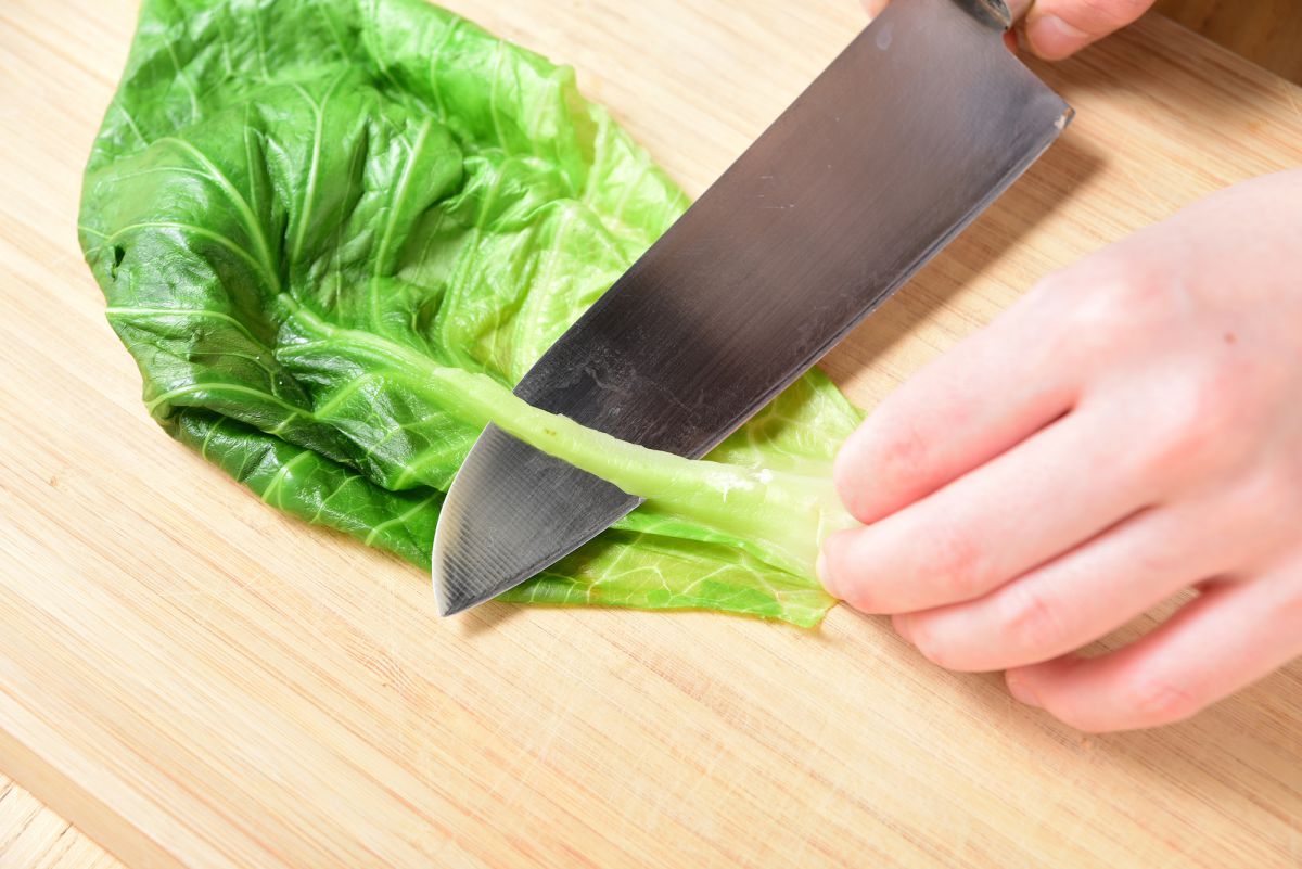 キャベツの芯を浮かせてその下に包丁を入れると、キレイに削ぎ取れます。こうすることでキャベツを巻きやすくなります。