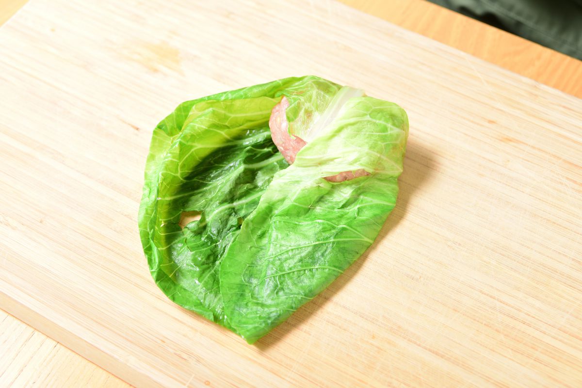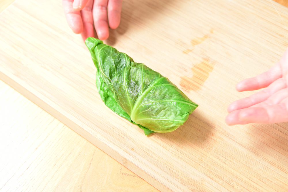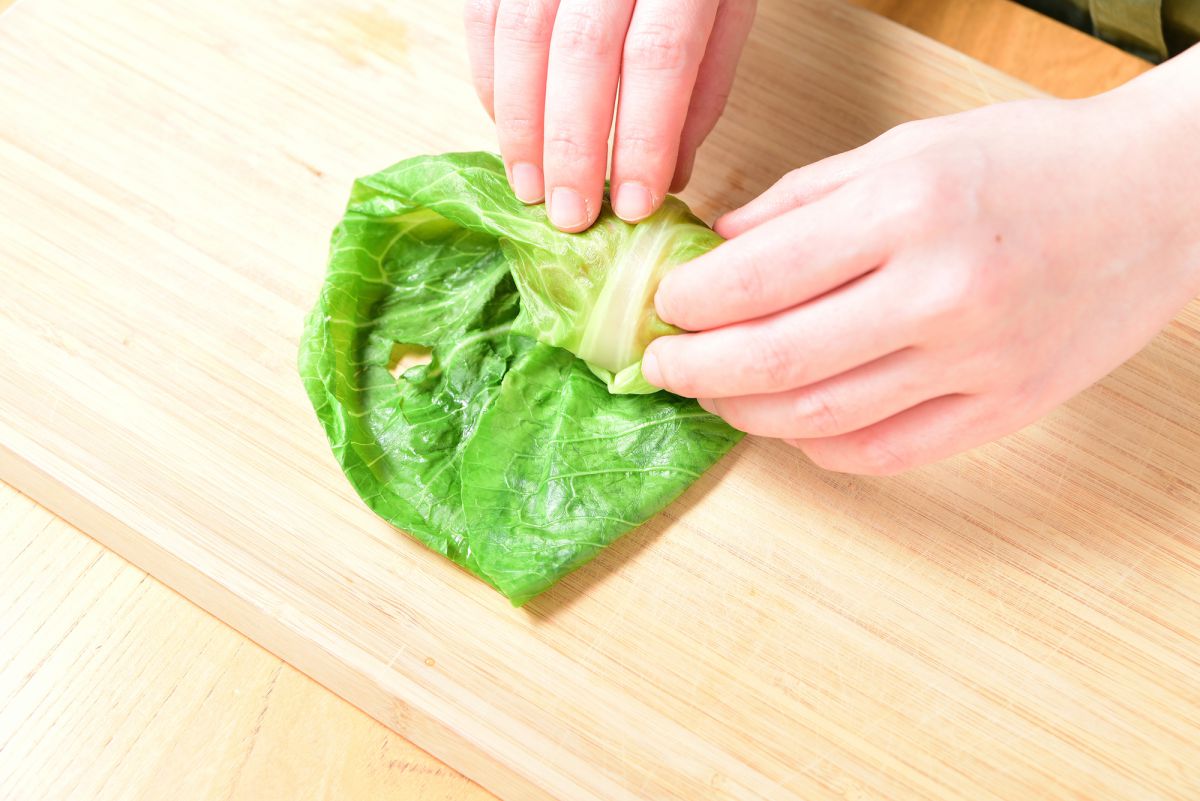 たねをキャベツで上手に巻くコツは、まずキャベツの手前と片方のみを折りたたんだ状態を作って、そのままくるくるロールしはじめること。