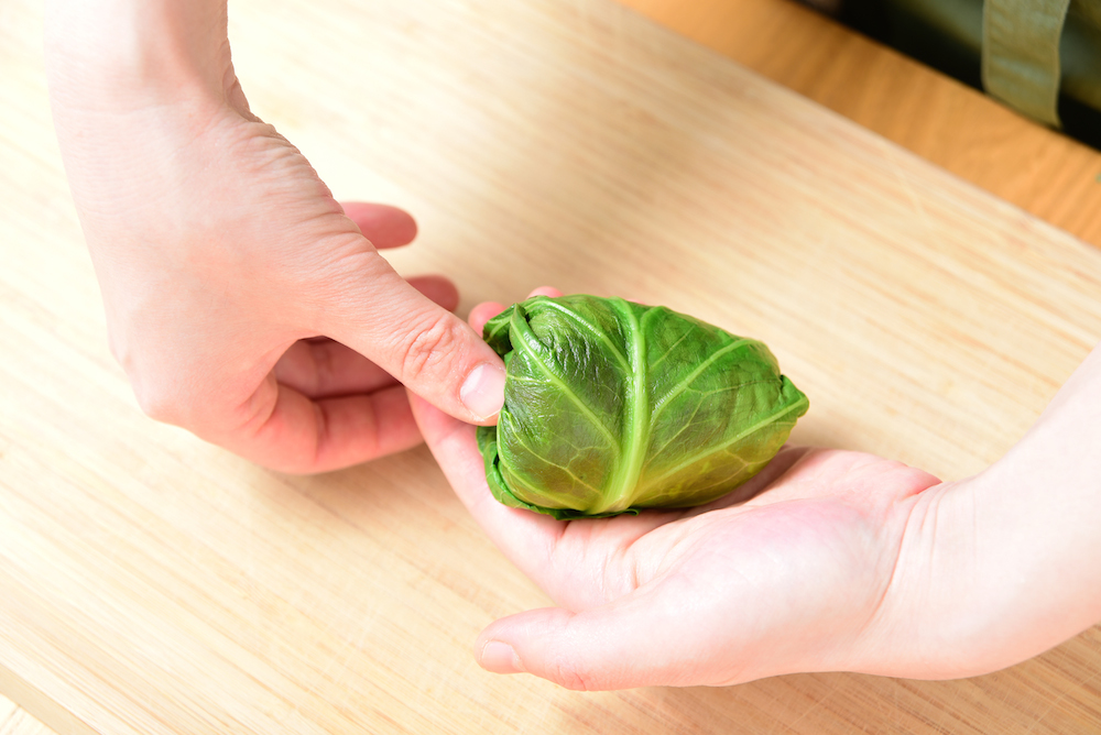 下の写真の状態になったら、折りたたんでいない方のキャベツを親指でグッと中に押し込んで完了です。