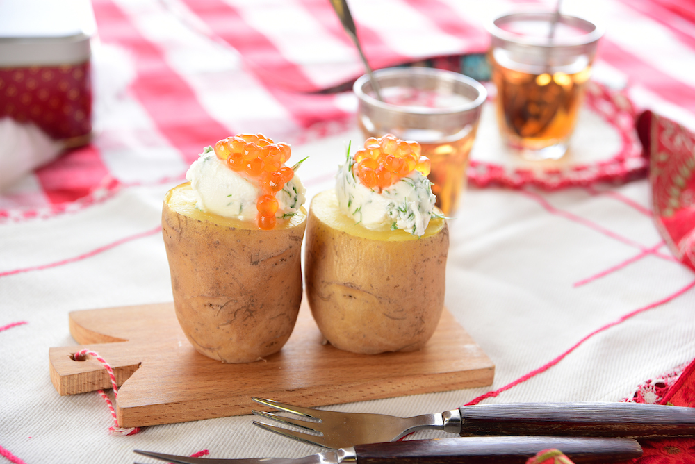 熱々のじゃがいもの上に好みの食材をトッピングするカルトーシュカは、ロシアではファーストフードとしても大人気で、モスクワをはじめとした各都市には専門店や屋台もよく見かけます。今回はサワークリームといくらで彩りましょう。