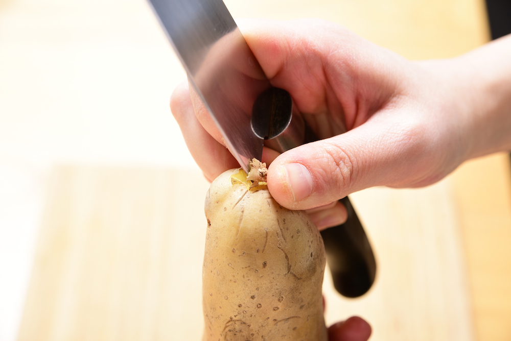 毒素があると言われるじゃが芋の芽は丁寧に除くのがベター。包丁の角を芽の部分に固定し、そのまま位置を変えずに360℃回すと上手にくり抜けます。