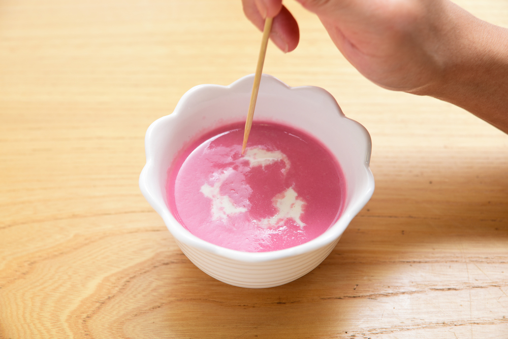 生クリームをスープの上に3点落としたら、点の先からすっと竹串を入れて、線がつながるように円を描いてみましょう。ハート型を意識しても◎
