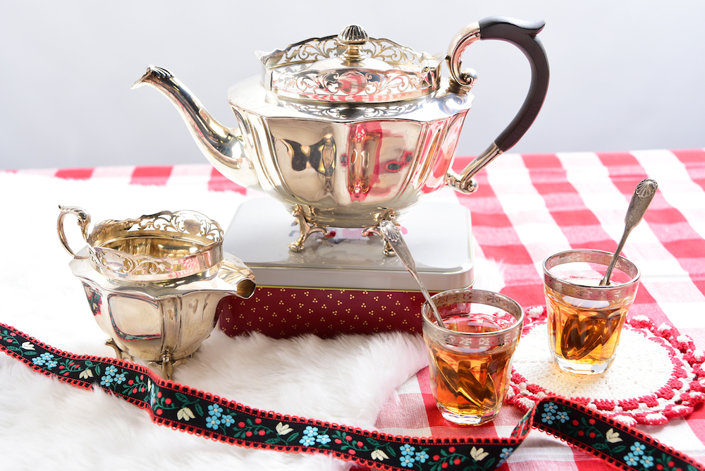 ロシアンティーをイメージしたシルバーのティーセットを置けばリッチな雰囲気も加わります。ヨーロッパの民族衣装を飾るために生まれたチロリアンテープをあしらうとよりキュートに。手芸やさんでお気に入りの色を見つけましょう。