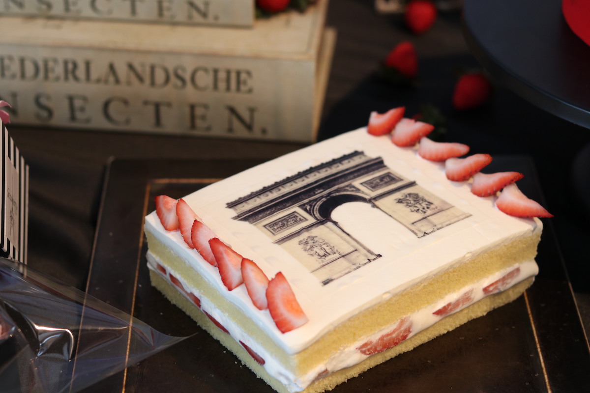 もちろんケーキにもパリのモチーフがたっぷり。凱旋門をイメージしたスクエア型のショートケーキや、エッフェル塔をイメージしたストロベリークッキーなど、目にも鮮やかなスイーツがずらりと並びます。