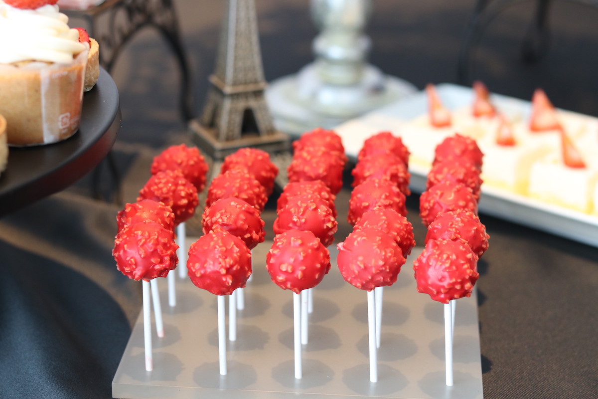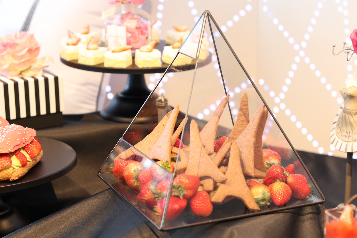 モノトーンのビュッフェテーブルにはパリをイメージさせるエッフェル塔や、ルーブル美術館のガラス型ピラミッド、オルセー美術館の大時計などのモチーフが飾られ、とってもスタイリッシュ! ピンクや赤のキュートないちごスイーツを引き立てています。