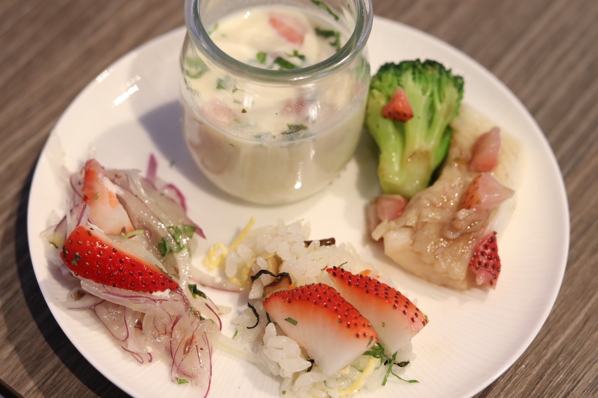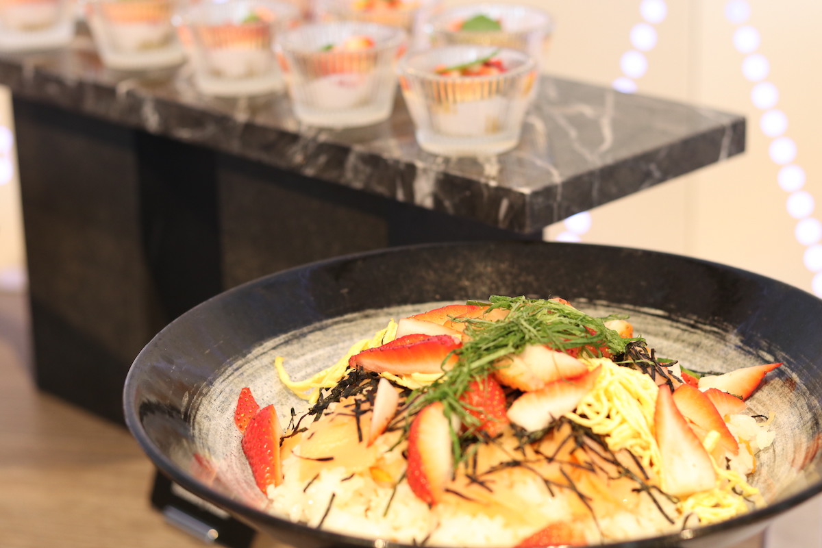 ストロベリーのサラダやスープ、ストロベリーをトッピングしたお寿司、ストロベリーソースで仕立てたお魚のグリルなど、ストロベリーグルメがずらり。少しずつ取ってひと口ずつ堪能すれば、また再びスイーツがおいしく食べられちゃいますね。