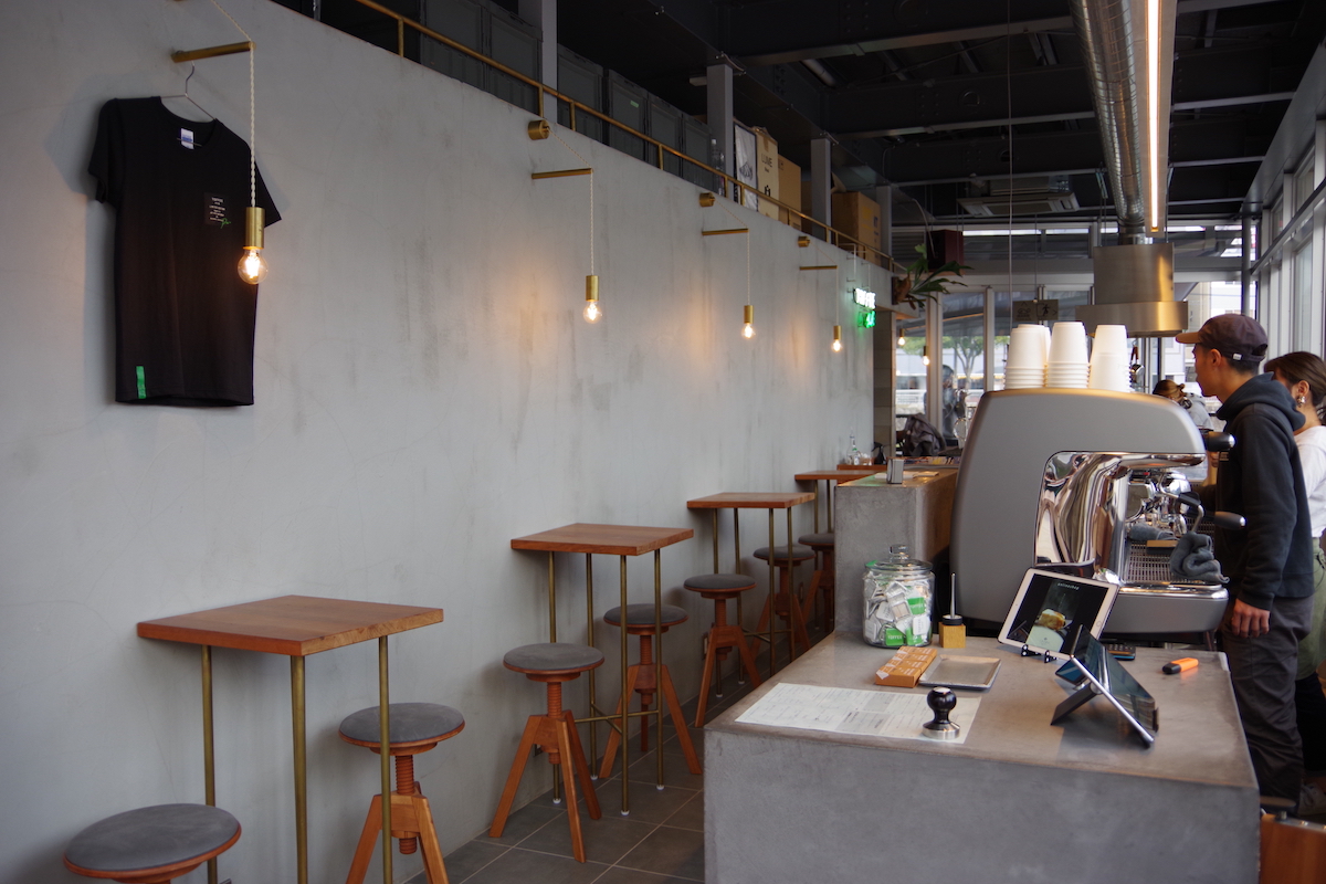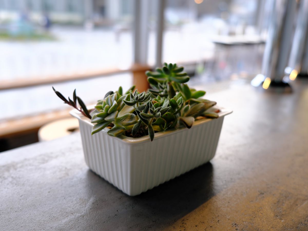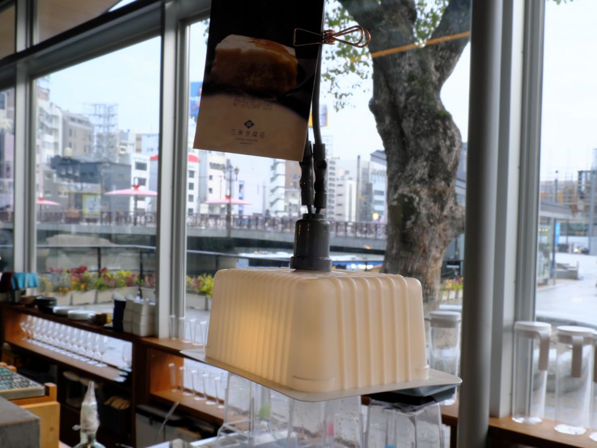 スタイリッシュなインテリアの中にさりげなく豆腐の容器を模したディスプレイが。店内に雰囲気に馴染んでいます。