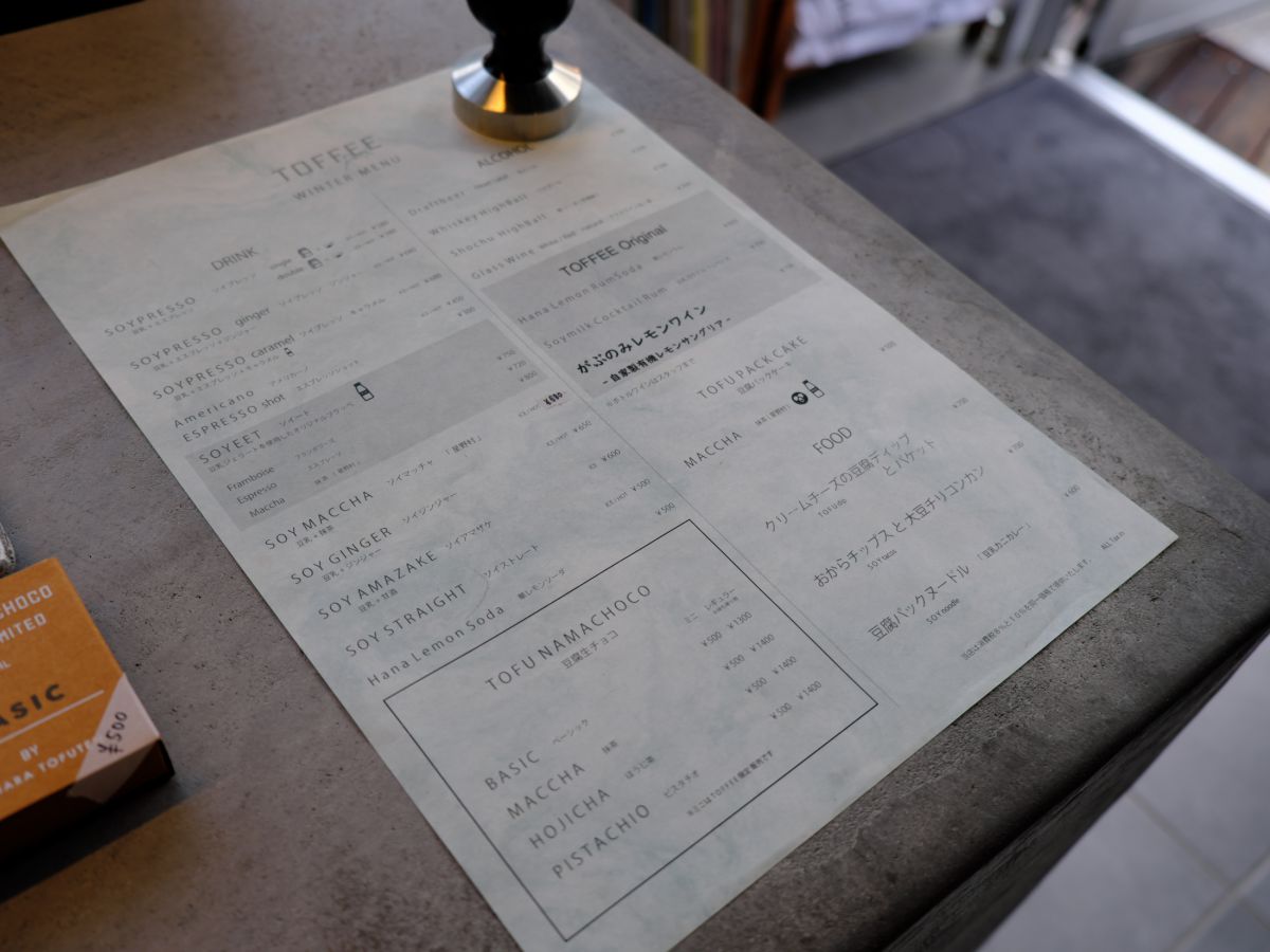 暑い季節には、豆腐ジェラートを使用したフラッペの「ソイート」や、八女市星野村の高級抹茶を使用したソイマッチャ、アルコールに合うフードの取り扱いもあるので、全メニューを制覇したくなります。