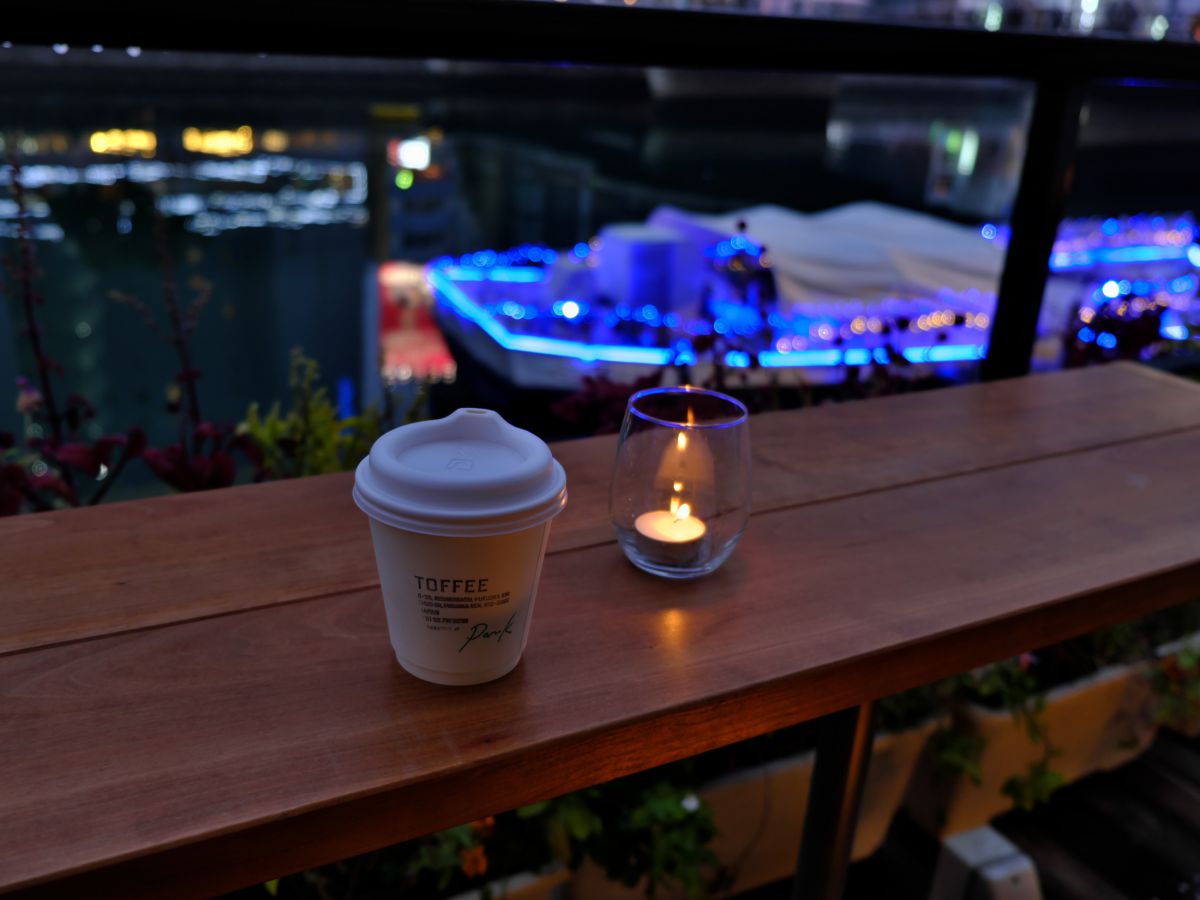 天気の良い日には、目の前に那珂川を望めるウッドデッキのテラス席に座ってみてはいかがでしょうか?奥に見えるのは、水上バス。夜のムーディーな雰囲気もすてきです。
