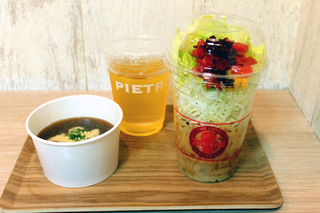 ミオミオでは、ピエトロ自慢のドレッシングや麺を使ったサラダパスタやスープが楽しめます。店内にはイートインスペースも完備。もちろんテイクアウトも可能なので、ランチタイムのお供にもぴったりです!