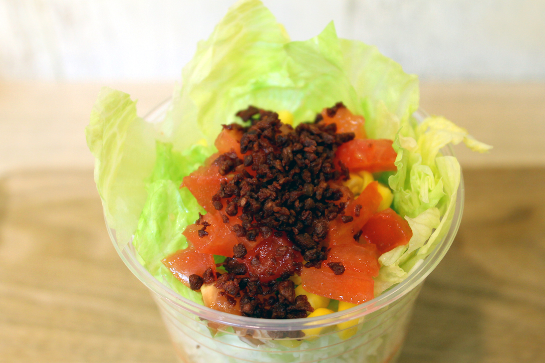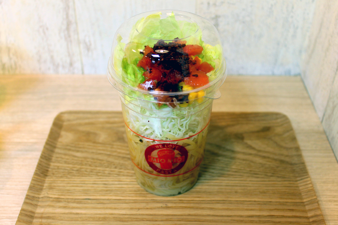 「ミオミオサラダパスタ」のサラダの層には、レタス、トマト、コーン、千切りキャベツ、ベーコンビッツなど、食感を楽しめるさまざまな具材がたっぷり。