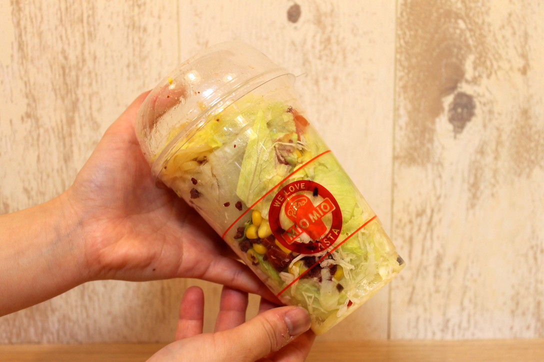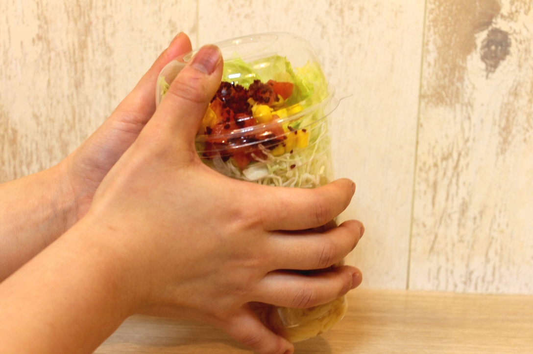 サラダパスタが縦長の容器に入っている理由はその食べ方にあります。フタがしっかりと閉まっていることを確認したら、容器を上下にシェイクしてください!