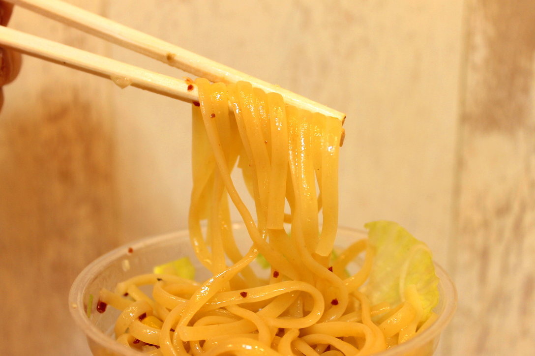 モチモチの平たい太麺のリングイネに、ドレッシングやベーコンビッツがしっかりと絡みます。 和風しょうゆドレッシングの、玉ねぎの旨味としょうゆの風味が、野菜たちをさらにおいしく引き立てます。カップを振ってから食べることで、おいしさプラス楽しさも感じられる一品です。