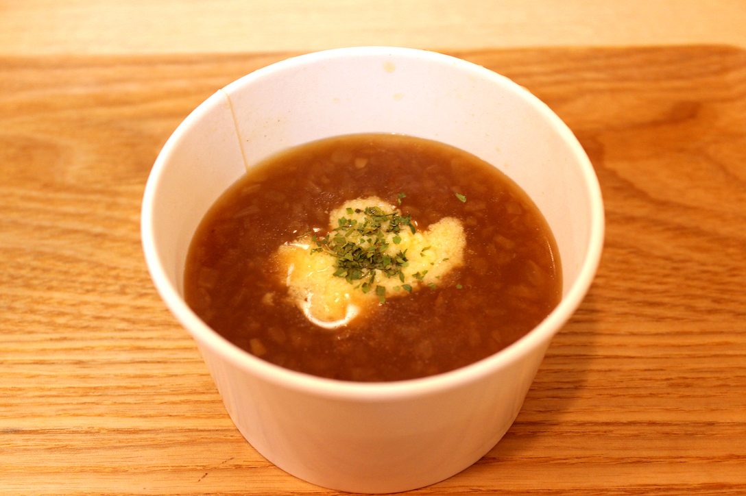 「キャロットラペサラダ(単品200円+税)」、「フォカッチャ(単品200円+税)」、「雑穀ごはん(単品200円+税)」、「チーズミートごはん (単品260円+税)」など、その日の気分で組み合わせが何通りも楽しめます。今回は季節限定の「あめ色たまねぎのオニオングラタン風スープS(単品260円+税)」をセレクトしました。