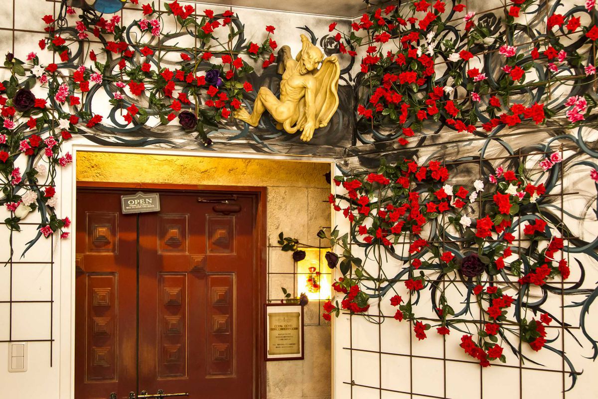 中国ムード満点の街から地下への階段を下りると、イメージは一転、真っ赤なバラで飾られた重厚な扉が現れます。
