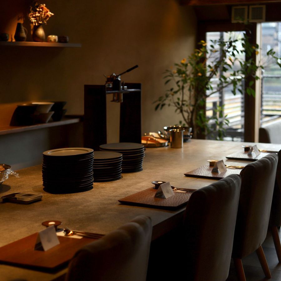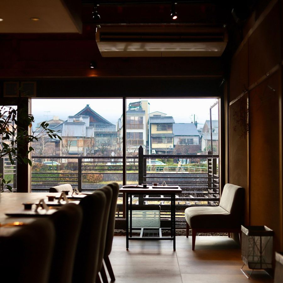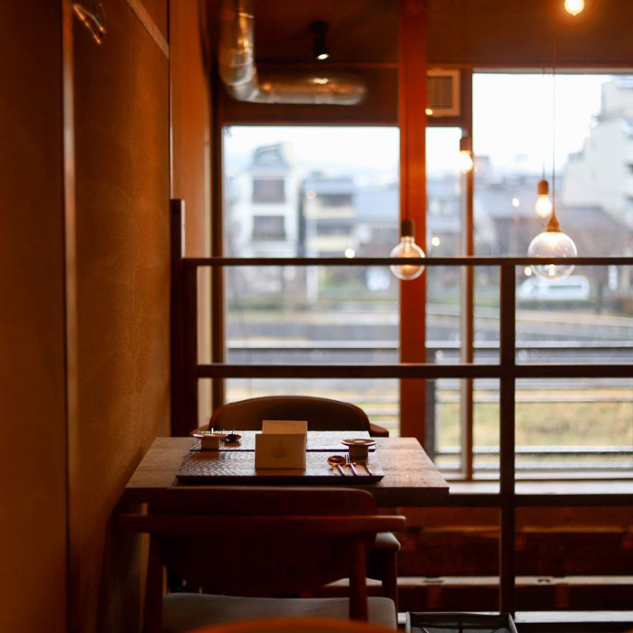 窓の向こう側には鴨川が流れる、賑やかな繁華街とはまったく異なる世界が広がる店内。1階は錦糸モンブランが生まれる瞬間を見られるカウンター、2階は数人で訪れてもゆったりと過ごせるような、テーブルが配されたフロア席となっています。この空間を包むスローな雰囲気は、日常的なことを忘れて心からくつろげるほどに居心地よし。